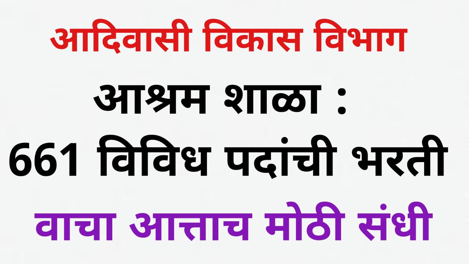 महाराष्ट्र राज्य आदिवासी विकास विभागांतर्गत आता 661 पदांसाठी भरती करण्यात येत आहे. यासाठी ई-मेल द्वारे अर्ज मागविण्यात येत आहेत. जाणून घेऊया याबाबतचे सविस्तर माहिती…