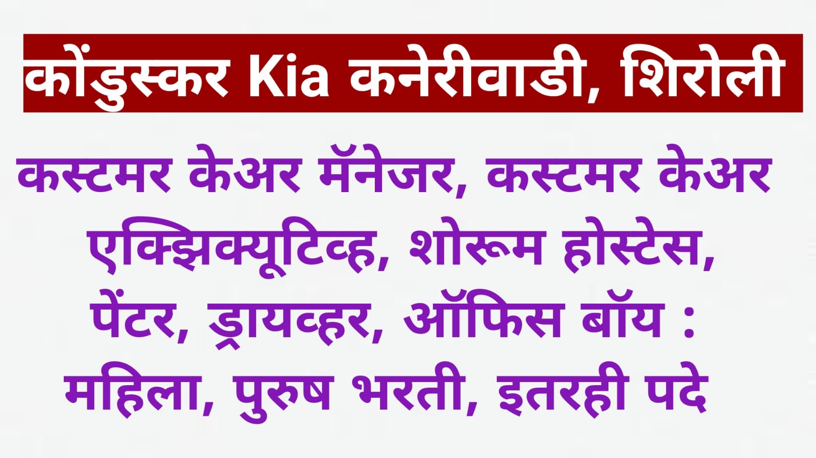 कोंडुस्कर Kia शिरोली व कनेरी वाडी येथे नव्याने सुरू होणाऱ्या युनिट साठी कस्टमर केअर मॅनेजर, कस्टमर केअर एक्झिक्यूटिव्ह, शोरूम होस्टेस, पेंटर, ड्रायव्हर, ऑफिस बॉय इत्यादी सह खालील पदांसाठी महिला, पुरुष यांना थेट मुलाखतीसाठी बोलावीत आहे.